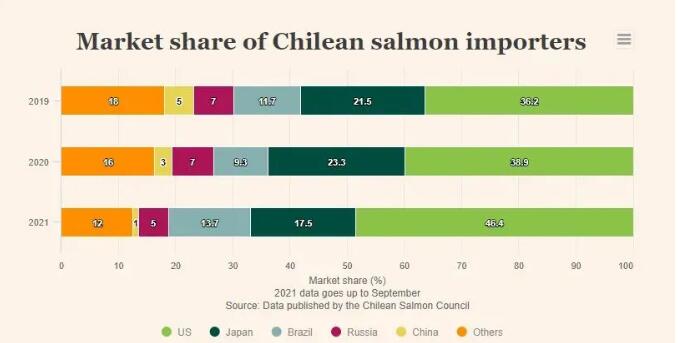 智利產(chǎn)地三文魚也呈現(xiàn)出供應減少、價格上浮的情況。據(jù)智利三文魚協(xié)會(ChileanSalmonCouncil)統(tǒng)計數(shù)據(jù)顯示,智利2021年第三季度出口約14萬噸養(yǎng)殖鮭鱒魚類,同比下降16%。從智利2021年1-9月的數(shù)據(jù)來看,美國、巴西的需求已恢復至疫情前水平,餐飲渠道需求的恢復和開發(fā)推動了智利三文魚對美國市場的出口量增加,并將價格維持在較高水平。而中國市場則尚未恢復,從2020年中期開始,市場需求一路下滑,雖然2021年第三季度同比增長20%,但仍低于疫情前的水平。